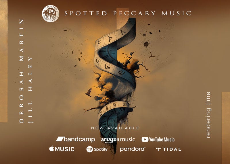 For over 30 years, Washington-based Deborah Martin has been inspiring listeners with her ambient electronic sensibilities. An award winning artist and Producer, Deborah works on her own projects and collaborates with other artists in pursuit of creating compositions that defy typical boundaries in the musical spheres. Crafting authentic and powerfully deep expressions in sound, Deborah’s music is always rich and simply beautiful, offering crystal clear perceptions and compelling voyages through an inner realm of ethereal visions, ancestral legends, and timeless places. Rendering Time is the 23rd project in Deborah’s discography. Her other Spotted Peccary label releases with Jill include 2021’s The Silence of Grace, and 2023’s Into The Quiet. Visit
